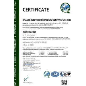 Graner Electromechanical Contractors holds ISO 9001:2015 certification, highlighting our commitment to a robust quality management system.- Qatar Civil Defence (QCD) and NFPA alignment for fire protection services- ASHGAL standards for STP operations and maintenance- HSE and Qatar Construction Standards (QCS) adherence across projects