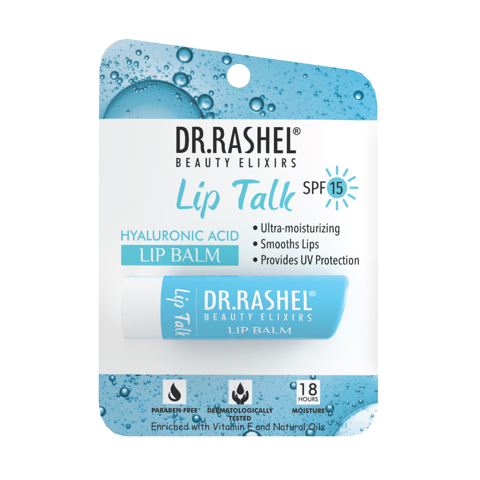 Dr. Rashel Hyaluronic Acid Lip Balm hydrates, nourishes, and protects lips with hyaluronic acid, natural oils, and SPF 15, leaving them plump all day.